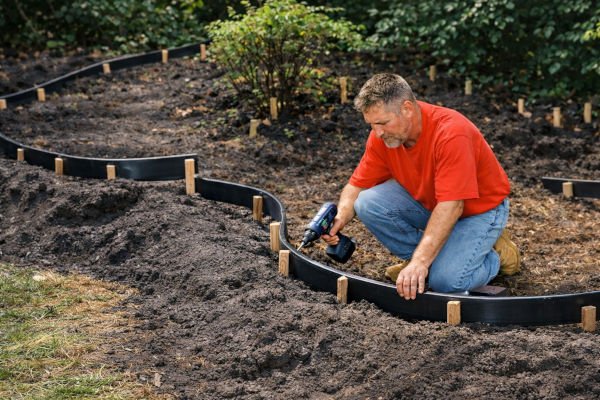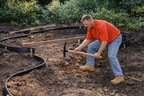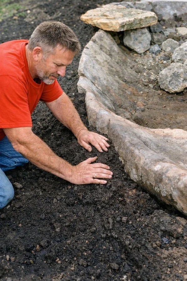 You build up as you dig down, so every shovelful of dirt does double duty. Wooden stakes and garden edging define the perimeter, and Rock-on-a-Roll eliminates the need for most of the stone.