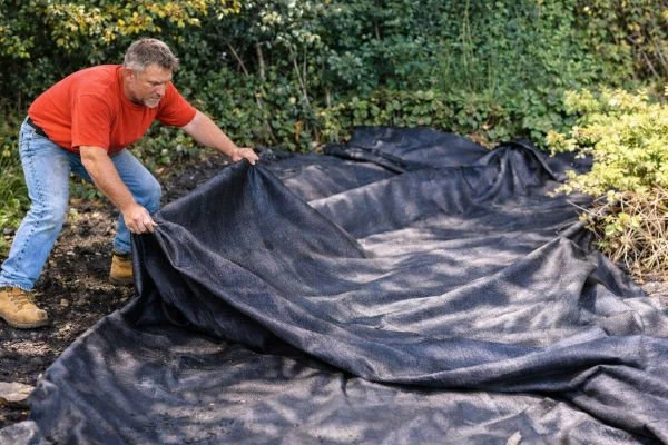 Step 4. We lay down protective fabric to guard against puncture from the bottom. Here we are using geotextile fabric, but old carpets or blankets also work well - just be sure there aren't any staples left in the carpeting.
