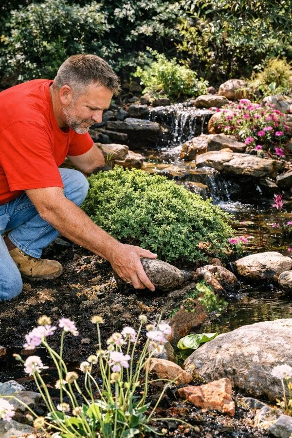Step 8. The thin edge that results from this technique makes the pond's rim easy to soften with plants. Low spreading ones, such as Japanese Junipers and ground covers look particularly good. We use some stone as accents.