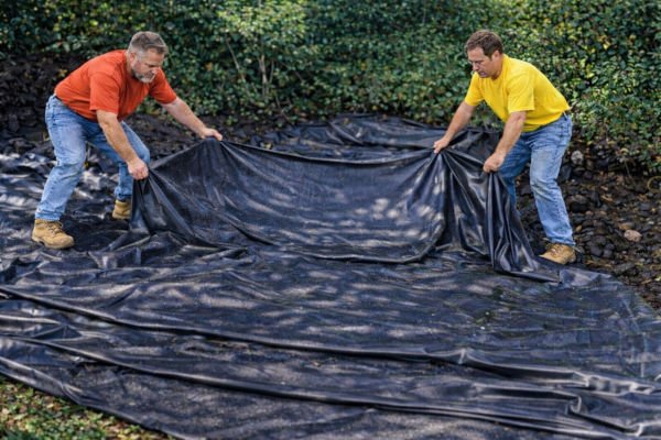 Step 5. We line the pond. We used a single piece to cover the entire project. If size or shape prohibit that, each pond or stream can be lined with a separate piece, overlapping the uphill piece into the top of the downhill piece. Lay the liner over the lawn edging, smooth it as much as possible, and consolidate folds. Streams should have folds facing downstream.